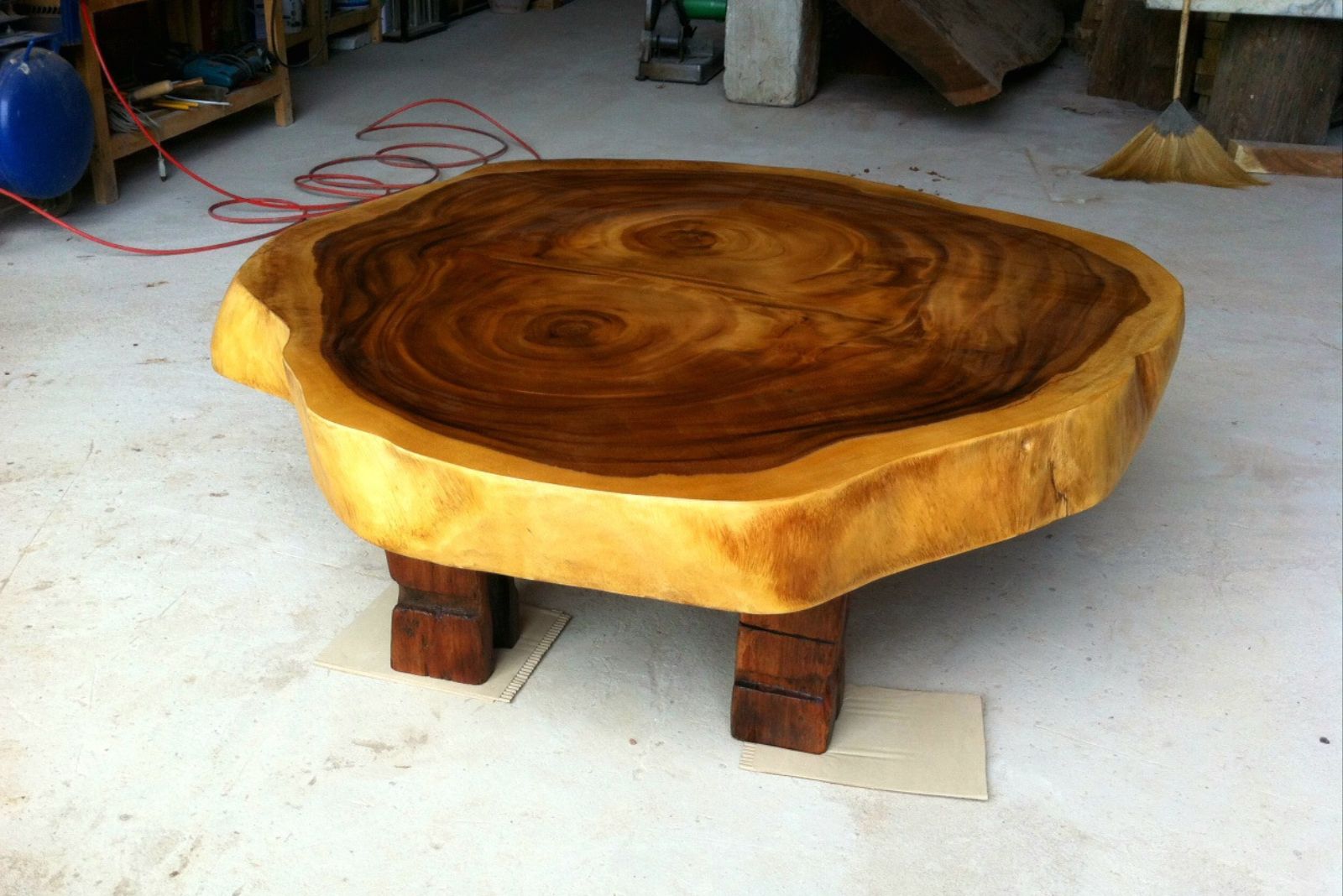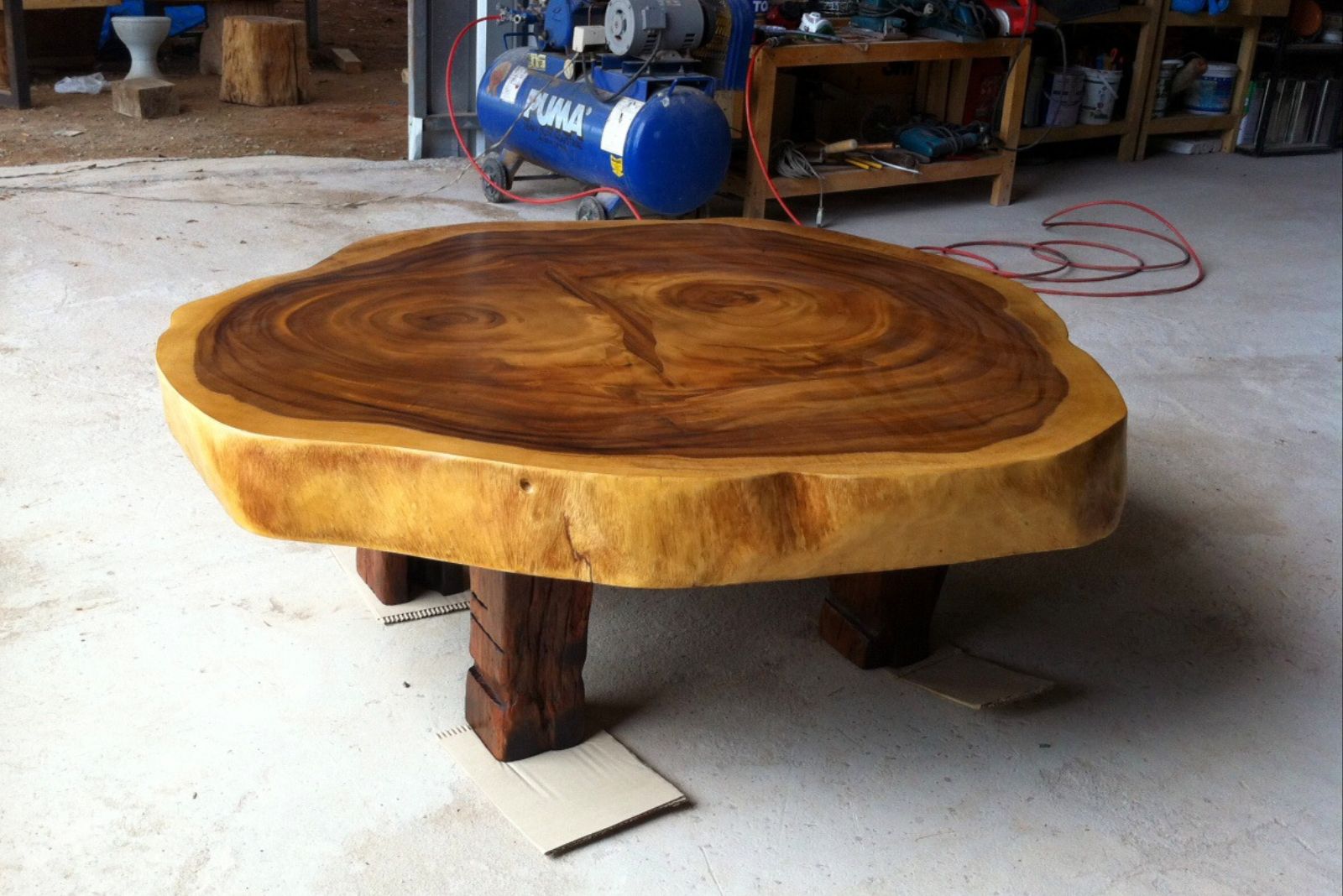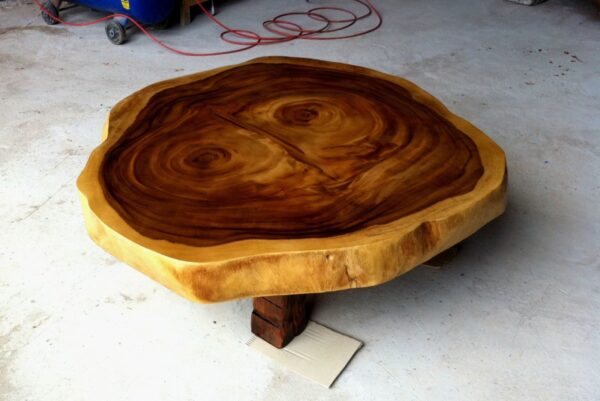 This bespoke coffee table is handcrafted from a single cross-cut slab of solid golden acacia, beautifully showcasing natural concentric grain patterns that radiate outward like organic rings of time. The rich contrast between the deep caramel-brown heartwood and the lighter golden sapwood edge creates a striking visual frame, enhancing the natural character of the piece.