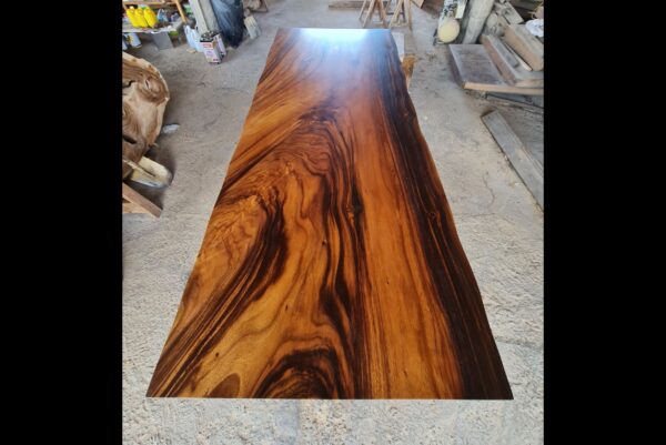Each edge follows the natural contour of the tree, preserving the raw live edge form while being finely smoothed for a clean and refined finish. The tabletop is expertly sanded and finished to enhance depth, clarity, and warmth, allowing the natural beauty of the wood to stand out from every angle.