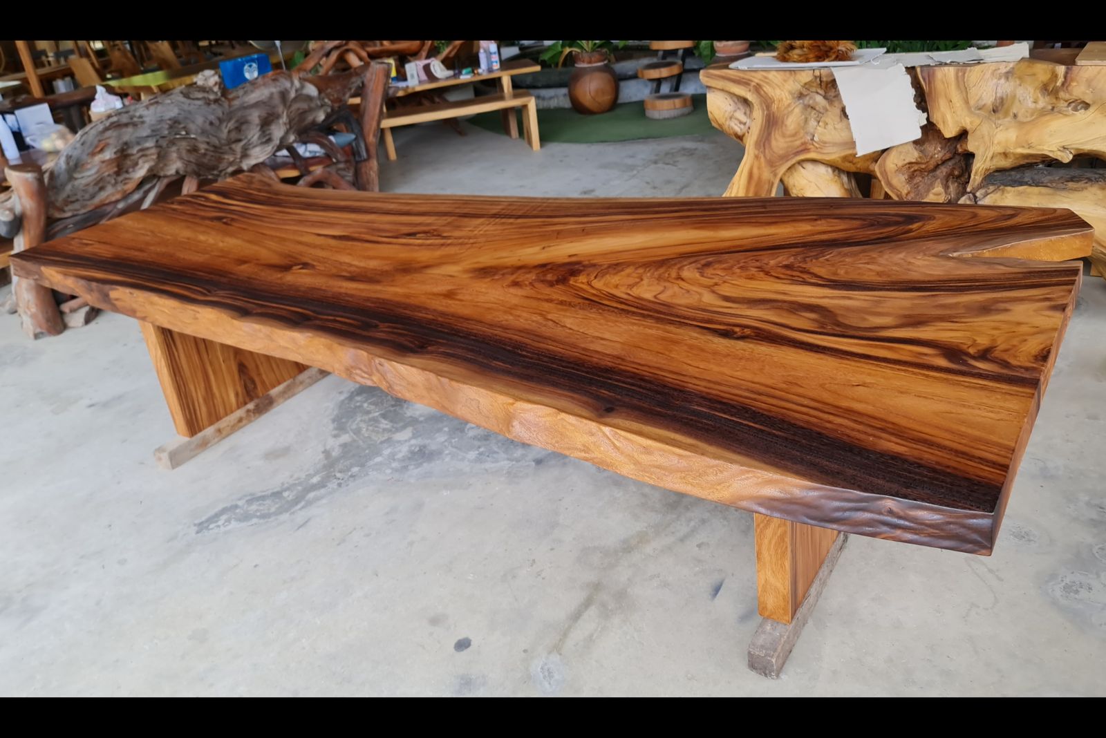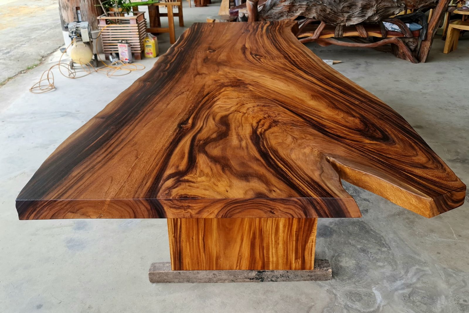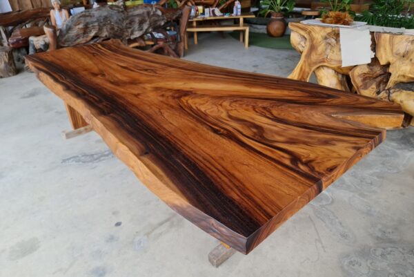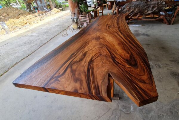 Finished in a smooth semi-gloss lacquer, the tabletop enhances the wood’s natural luster while providing durability for daily use. The base is constructed from solid golden acacia wood slab legs, designed to complement the thickness and organic shape of the top while offering strong, stable support.