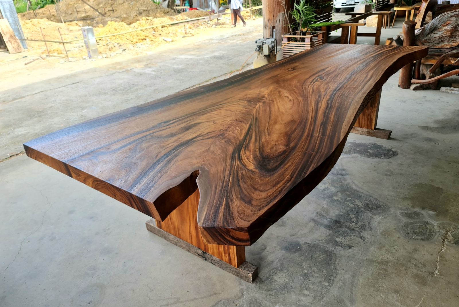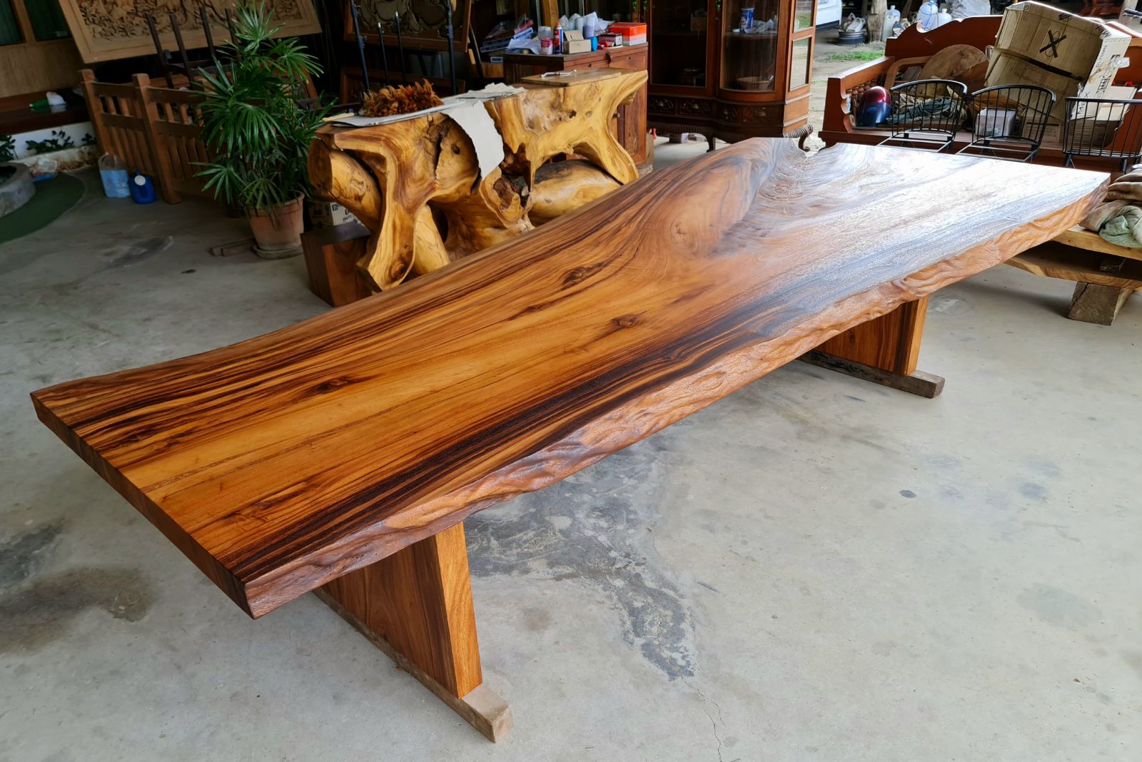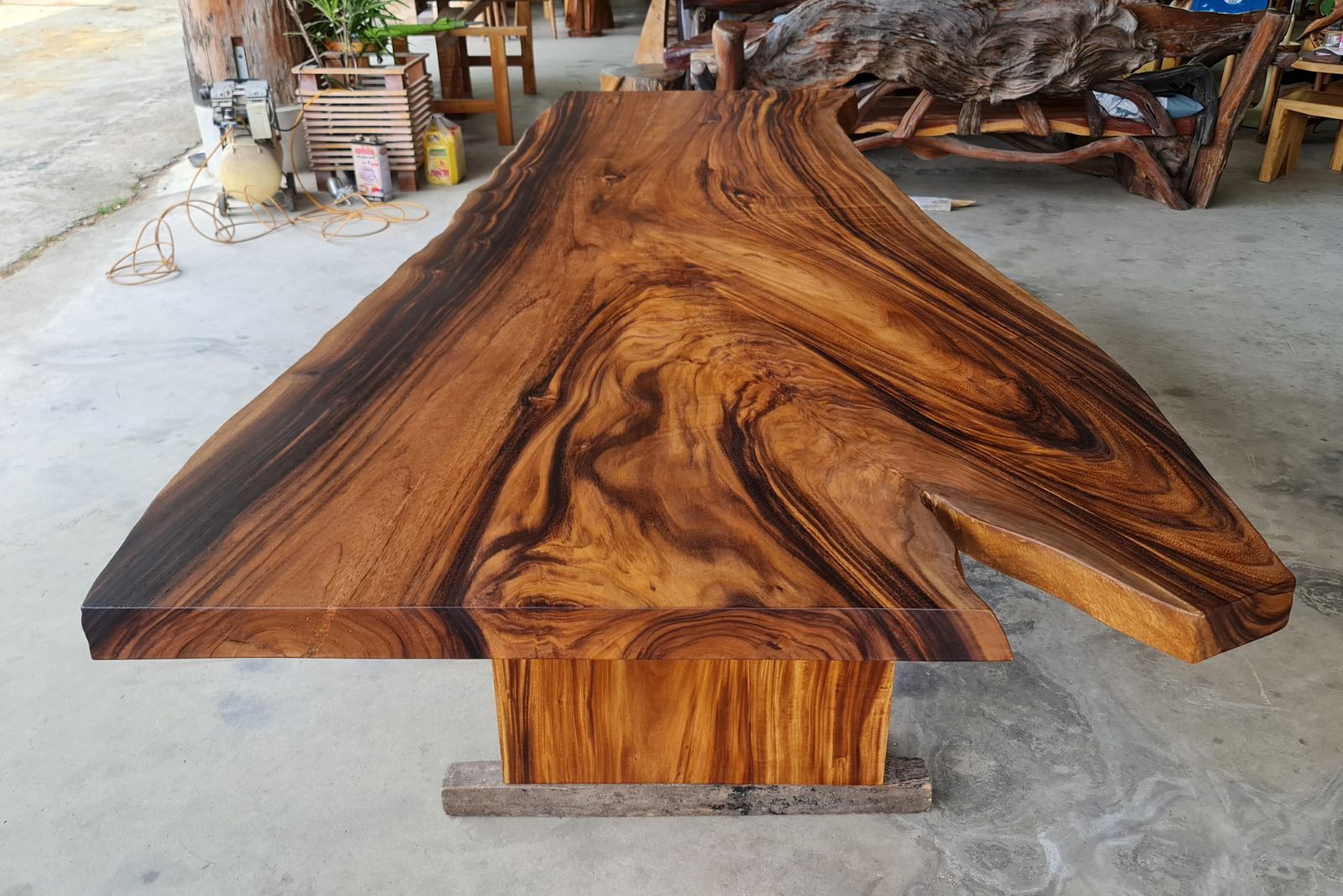 Finished in a smooth semi-gloss lacquer, the tabletop enhances the wood’s natural luster while providing durability for daily use. The base is constructed from solid golden acacia wood slab legs, designed to complement the thickness and organic shape of the top while offering strong, stable support.