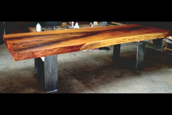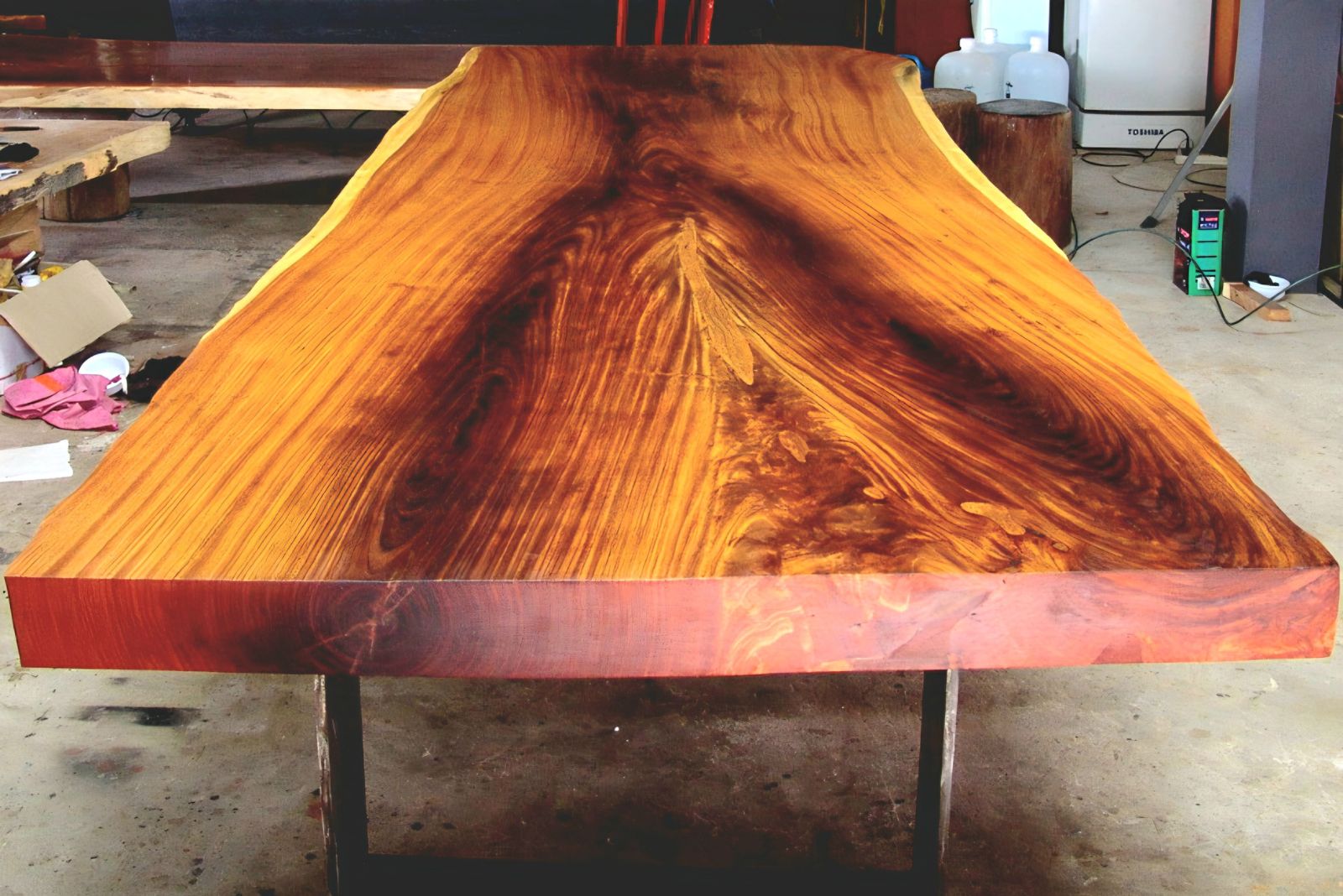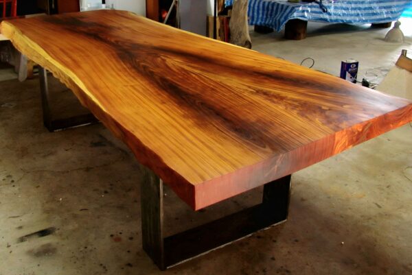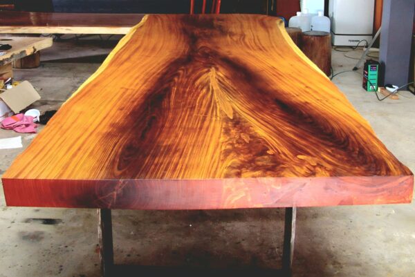 This bespoke live edge conference table is crafted from an exceptionally rare single slab of Thai rosewood, prized for its rich coloration and dramatic natural grain. The surface reveals deep chocolate tones, warm golden highlights, and flowing organic patterns that move seamlessly across the entire slab, creating a striking and one-of-a-kind centerpiece.