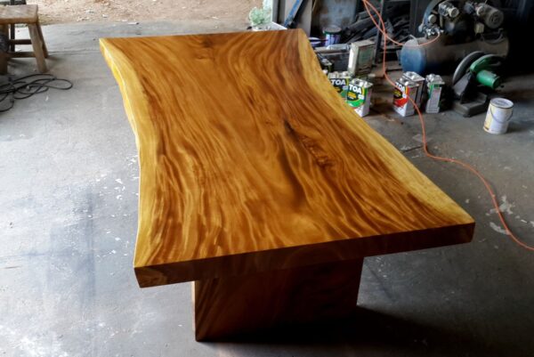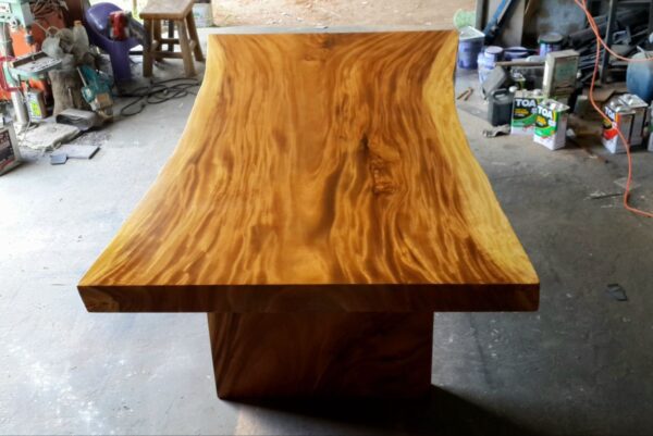 The tabletop is thick, solid, and finished to a smooth semi-gloss, enhancing the natural color while protecting the wood for everyday use. Each detail, from the subtle tonal variations to the flowing grain lines, makes this piece completely one of a kind.
