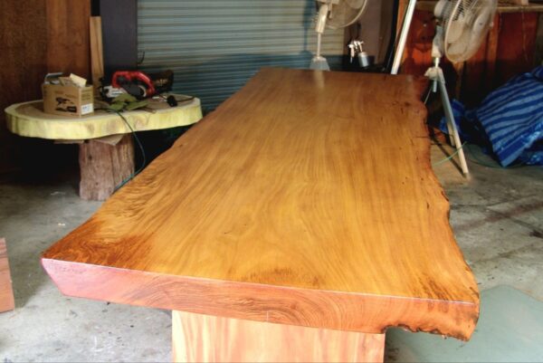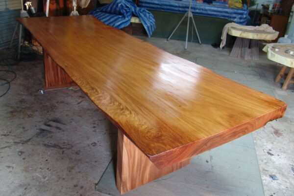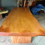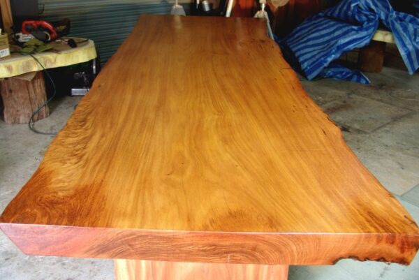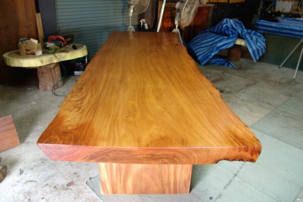 This bespoke dining table is handcrafted from a rare single slab of Thai rosewood, showcasing a beautifully balanced live edge form and rich natural character. The slab features warm reddish-brown tones blended with golden amber highlights and subtle darker grain lines that flow naturally across the surface, creating depth and movement.
